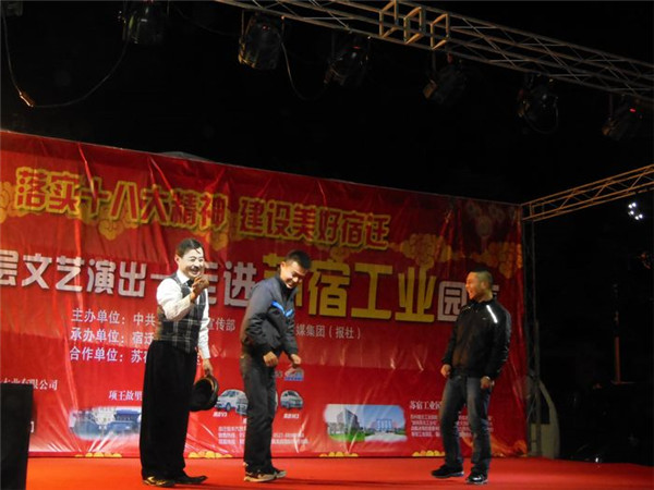 落實十八大精神 建設(shè)美好宿遷”服務(wù)基層文藝演出由市委宣傳部、宿遷報業(yè)傳媒集團(tuán)(報社)主辦,宿遷新聞網(wǎng)承辦,旨在深入宣傳黨的十八大和市委四屆三次全體(擴(kuò)大)會議精神,落實文化惠民措施,將走進(jìn)全市100余個鄉(xiāng)鎮(zhèn)、社區(qū),將包括歌舞、雜技、曲藝、戲劇等內(nèi)容的百場精彩演出奉獻(xiàn)給廣大基層群眾,此次受園區(qū)邀請,專程赴園區(qū)公舍演出,為廣大工友及周邊居民帶來了一場精彩的文化大餐。
