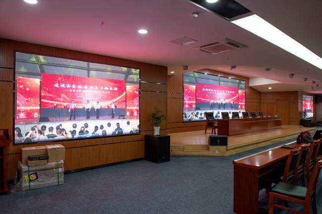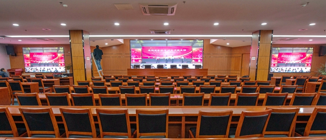 經(jīng)過改造,安全教育館新增3塊LED屏幕,其中主席臺處主LED顯示屏面積約20平方,東西兩側(cè)輔助LED顯示屏各約6平方。LED屏幕采用顯示單元像素間距為P2-2.5,具有顯示面積大、分辨率高、超高對比度、超寬視角、無縫拼接、維護方便等優(yōu)點。改造后進一步提升了視頻會議效果,增加了會場多功能性。