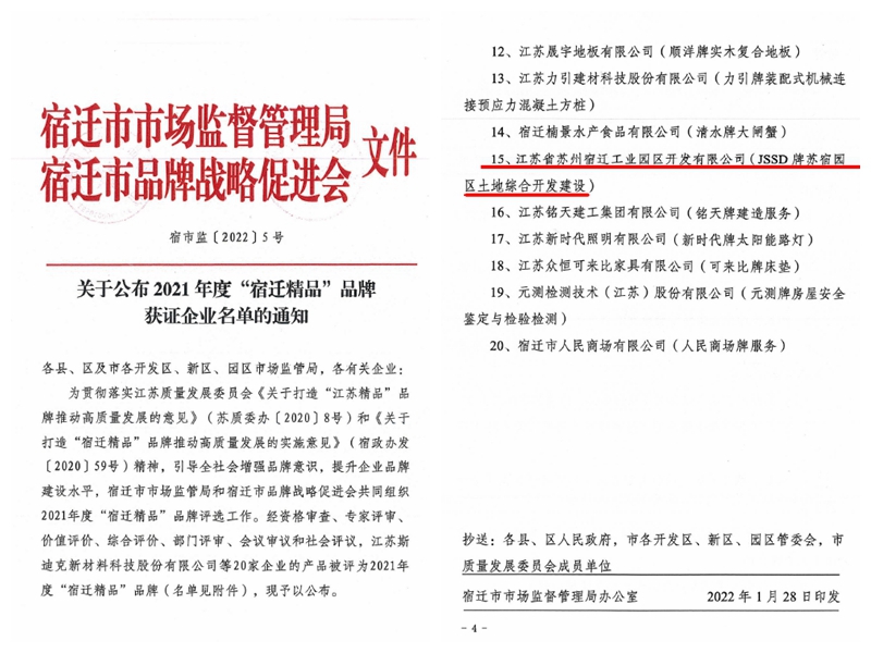 近日,江蘇省蘇州宿遷工業(yè)園區(qū)開(kāi)發(fā)有限公司(簡(jiǎn)稱開(kāi)發(fā)公司或JSSD)獲得2021年度“宿遷精品”品牌認(rèn)定。