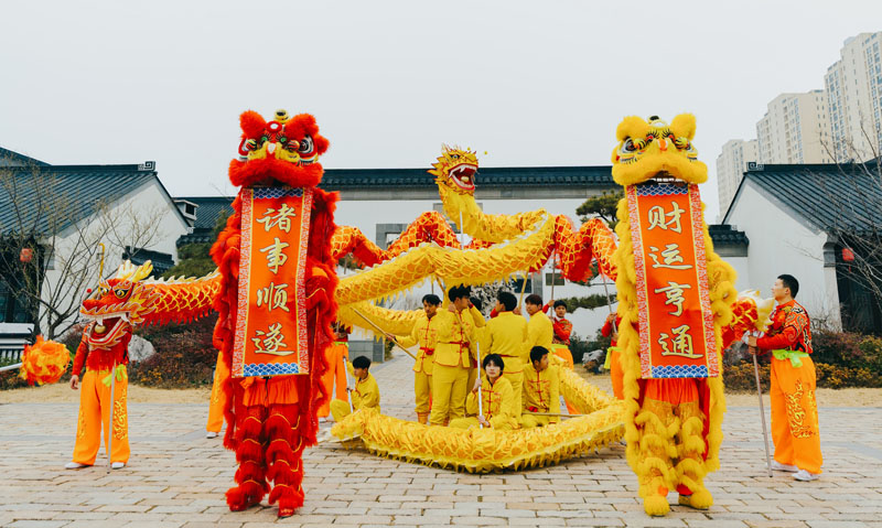 隨著激昂的鑼鼓聲響起,兩條金色巨龍和威風(fēng)凜凜的醒獅閃亮登場。舞龍者們步伐矯健,巨龍?jiān)谒麄兊奈鑴?dòng)下時(shí)而盤旋,時(shí)而騰飛,身姿矯健,氣勢磅礴。醒獅更是靈動(dòng)活潑,高高躍起,精準(zhǔn)地叼取懸掛在空中寫有“財(cái)運(yùn)亨通,諸事順?biāo)?rdquo;的對(duì)聯(lián),寓意著將財(cái)運(yùn)和福氣傳遞給現(xiàn)場的每一個(gè)人,引得觀眾陣陣歡呼。